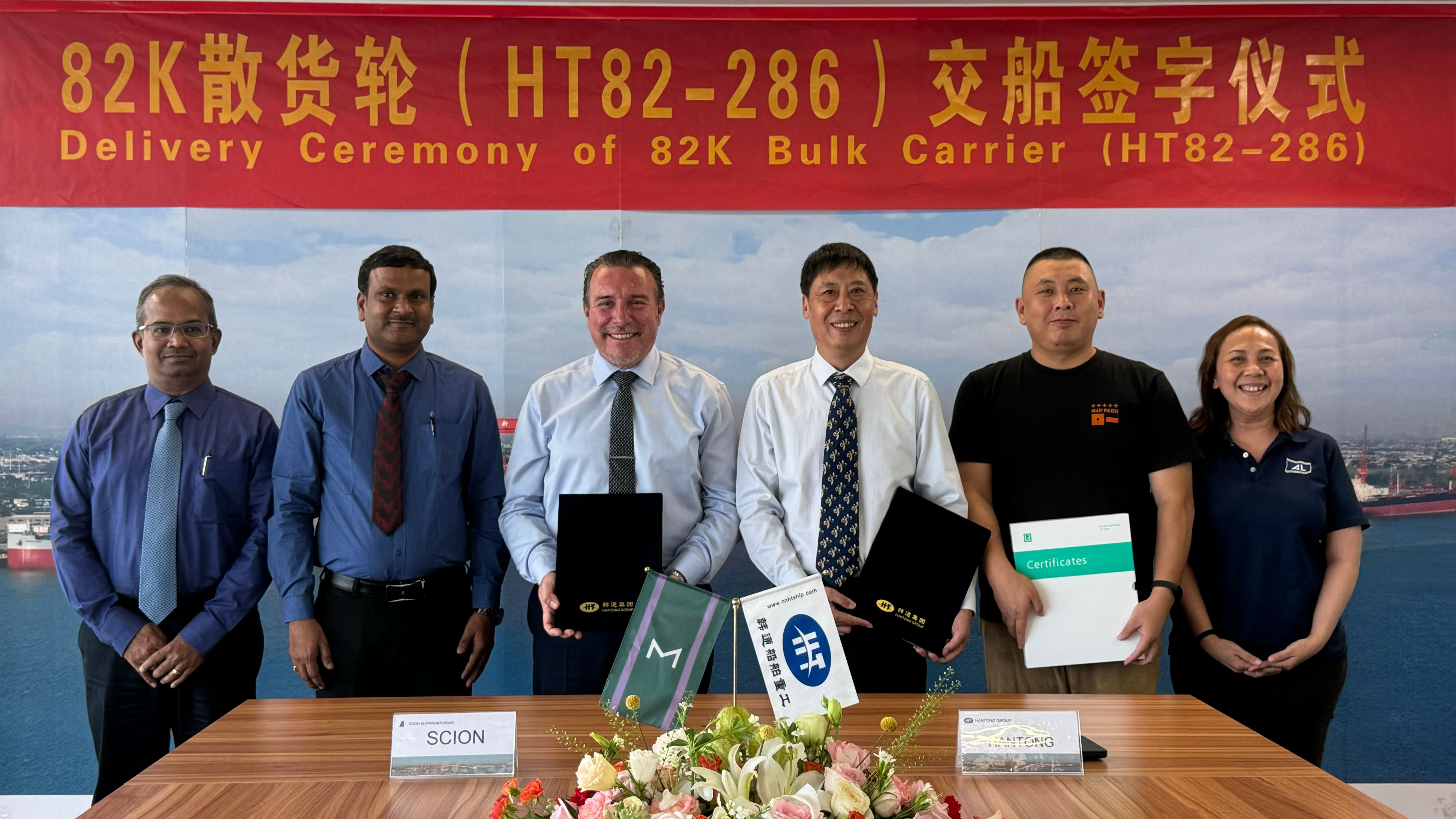 2024年8月12日,韓通集團(tuán)為德國Scion船東建造的首艘82000噸散貨輪 “SCION MATHILDA”(船體號:HT82-286)順利簽字交付。