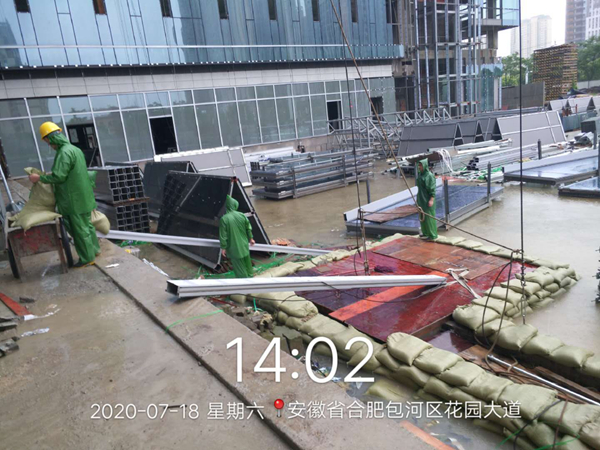 針對入梅以來嚴(yán)峻的防汛形勢,已交付及在運(yùn)營項(xiàng)目積極協(xié)調(diào)物業(yè)公司,共同迎戰(zhàn)強(qiáng)降水天氣。位于合作化路和南二環(huán)交口的安糧國貿(mào)中心是此次防汛形勢較嚴(yán)峻的重點(diǎn)項(xiàng)目,特別是降雨量突破合肥市歷史極值的7月18至19日,積水內(nèi)澇直接影響到地下室的安全。險(xiǎn)情出現(xiàn)時(shí),一線人員及時(shí)匯報(bào),各崗位人員在半個(gè)小時(shí)內(nèi)到崗參與排險(xiǎn)工作。項(xiàng)目部對地庫出入口等易形成倒灌水的危險(xiǎn)區(qū)域安排工作人員堆砌沙袋,打開集水井蓋板,保證積水最大流量的排放。同時(shí)配合唯品會工作人員啟動(dòng)區(qū)域排水泵,對易積水難排水區(qū)域進(jìn)行再清理再疏通,隨著南二環(huán)和合作化路積水水位逐漸下降,安糧國貿(mào)中心順利通過了此次防汛考驗(yàn)。