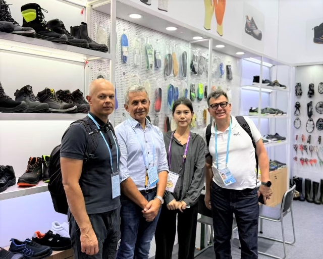 在工具類展區(qū),安糧在常規(guī)安全鞋產(chǎn)品基礎上,新增勞保手套、多功能剪刀、冰爪、反光材料等多款新產(chǎn)品,全面覆蓋戶外安全防護場景,凸顯“專業(yè)性”與“全面性”雙重優(yōu)勢。為讓客戶直觀感受產(chǎn)品品質,展區(qū)采用原木色層板與洞洞板靈活組合的裝修設計,方便客戶觸摸、體驗產(chǎn)品的材質、工藝與功能,如拉扯勞保手套的耐磨度、體驗多功能剪刀的剪切效果、查看反光材料在模擬黑暗環(huán)境下的警示亮度。目前已有來自法國的戶外用品品牌商提出樣品寄送需求,另有來自智利的的安全防護設備經(jīng)銷商明確表達長期合作意向。