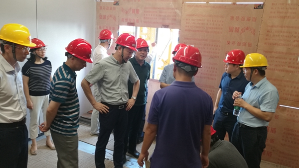 曹訓(xùn)立董事長一行來到精裝修樣板層,參觀了獨立式辦公室、開放式辦公區(qū)、會議室等主要區(qū)域,對空調(diào)系統(tǒng)、電梯設(shè)備、墻地面裝飾材料等進(jìn)行了細(xì)致了解,并對會議中心提出了具體要求。