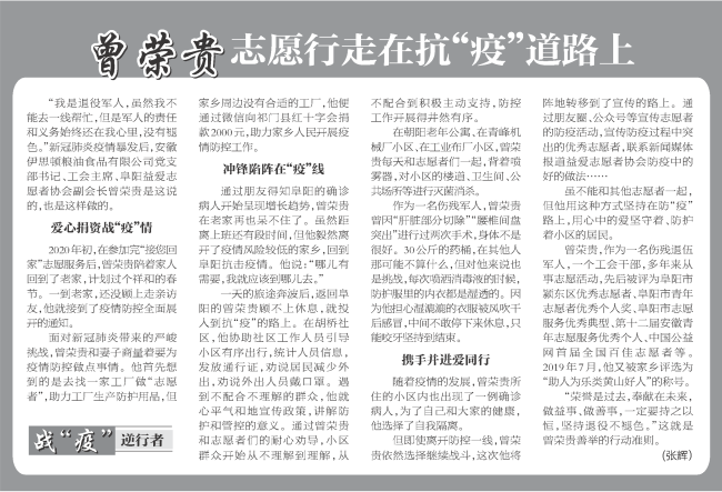 黃山人曾榮貴是安徽伊思頓糧油食品有限公司黨支部書記,他是一名傷殘退伍軍人,擔(dān)任阜陽益愛志愿者協(xié)會(huì)副會(huì)長(zhǎng),曾積極參與過大小百余次公益活動(dòng),被評(píng)選為“助人為樂黃山好人”稱號(hào)。在今年新冠病毒蔓延的特殊時(shí)期,曾榮貴不僅捐資戰(zhàn)“疫”,更沖鋒在前。正月初一,他就協(xié)同當(dāng)?shù)卮鍍晌e極投入到防控疫情一線,白天走進(jìn)村委會(huì)和公共場(chǎng)所開展防疫消毒,幫助村兩委工作人員開展出入人員管控;晚上編輯公眾號(hào)文章,宣傳防疫活動(dòng)和防疫過程中的好做法,用行動(dòng)踐行了共產(chǎn)黨員的初心使命,發(fā)揮了黨員的先鋒模范作用。