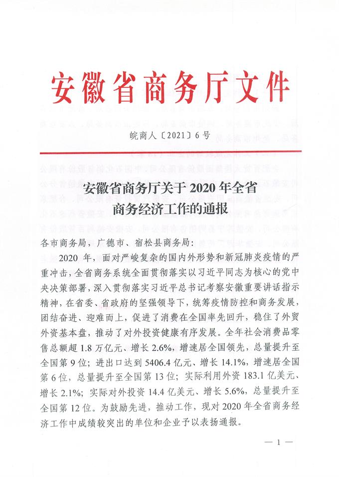 全省商務(wù)工作電視電話會(huì)議2021121日上午在合肥召開。會(huì)上,省商務(wù)廳張箭廳長對2020年全省商務(wù)經(jīng)濟(jì)工作中成績較突出的單位和企業(yè)予以表揚(yáng)通報(bào)。